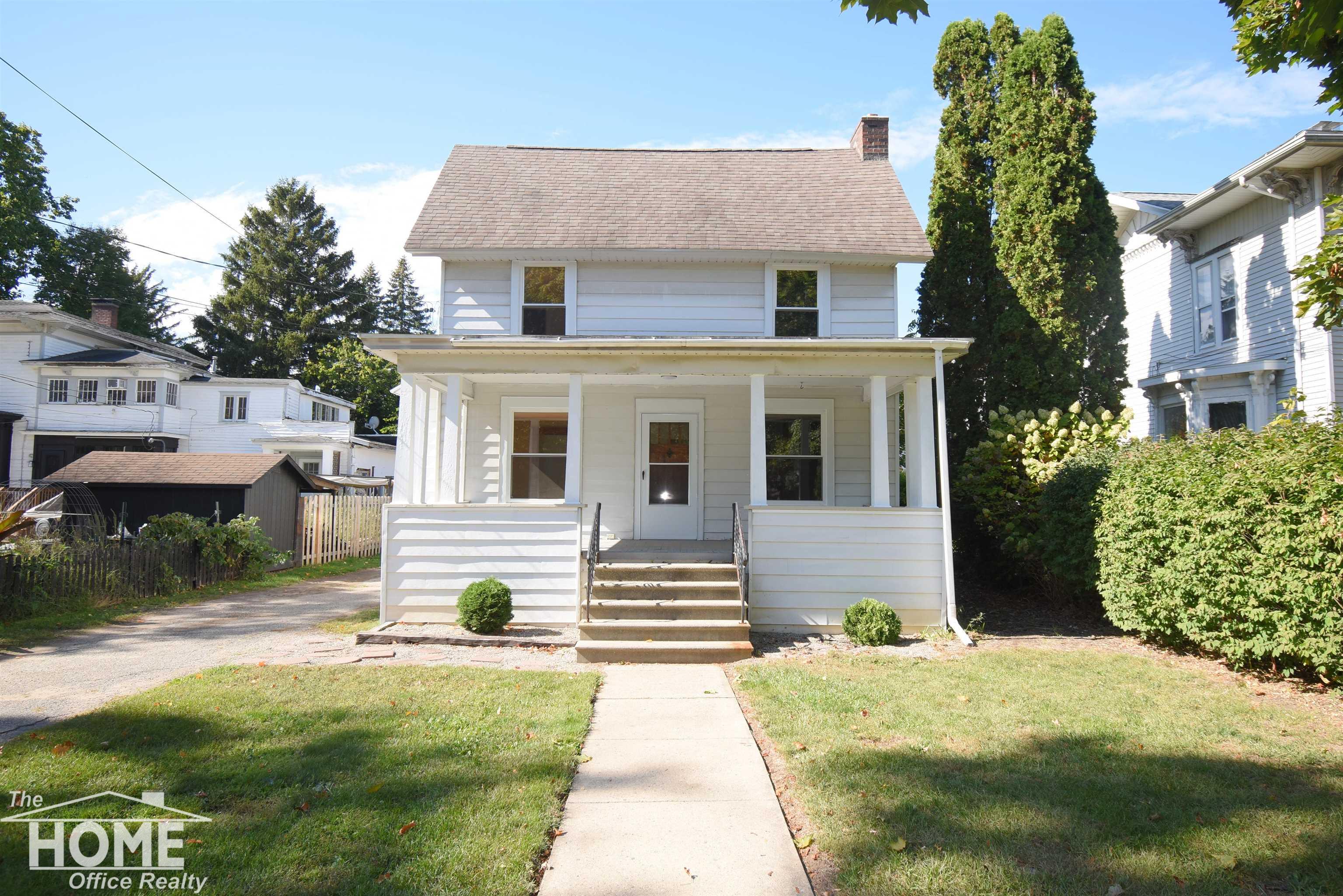 Northside Owosso - Huge covered front porch, perfect for a porch swing and welcomes you into the open living room with hardwood floors, orig. woodwork, fireplace, and open staircase! Large windows, new 2025! New white kitchen with appliances 2025! Archway to breakfast nook. Full basement is very useable and partially finished. Washer and dryer included! Renovated bathroom 2025! New furnace 2025! New electric panel 2025!