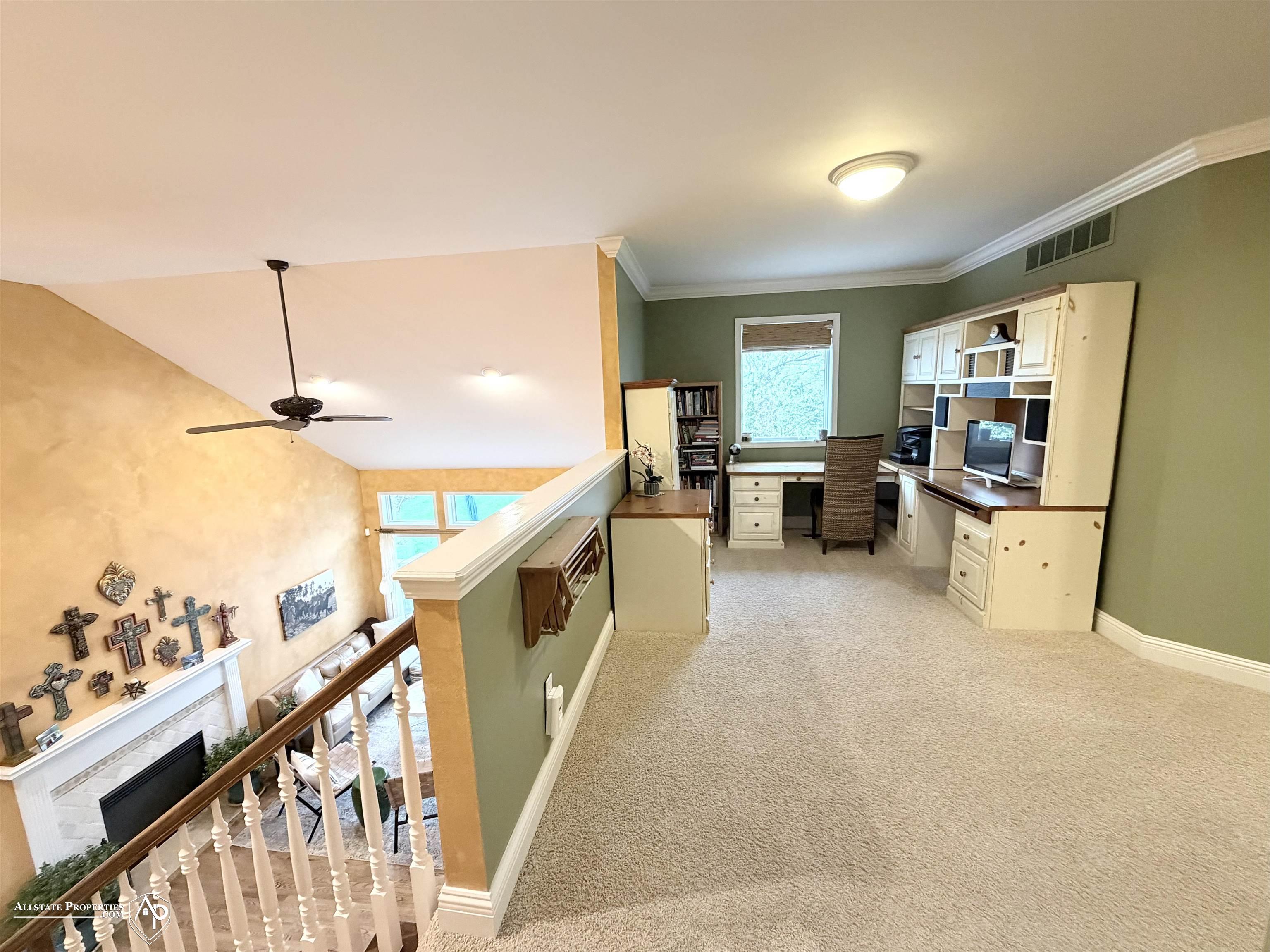 Welcome to this meticulously maintained, one-owner custom home filled with unique features and exceptional craftsmanship throughout. Every detail, from the heated tile floors to the crown molding, has been thoughtfully designed. The open-concept main floor features a spacious living room with a gas fireplace and a den/sitting room. The kitchen features stainless steel appliances, heated flooring, custom built-in cabinetry, a breakfast bar, and a stunning accent wall. The kitchen flows seamlessly into the dining area, which is perfect for entertaining. The mudroom includes custom built-ins, a built-in desk, and granite countertops for added convenience. All appliances are included, along with the built-in TV in the primary bedroom. The primary suite is a true retreat, featuring a cozy candlelit fireplace, heated tile floors, a large walk-in closet, and a luxurious en-suite bath with heated tile floors, a jetted soaking tub, a custom-tiled walk-in shower with a rainfall shower head, and elegant finishes throughout. Upstairs offers two additional bedrooms, including one with a walk-in closet, a loft overlooking the great room ideal for an office or study space, a full bath with granite countertops and an oversized vanity, plus laundry and linen storage. The finished basement provides exceptional additional living space. It includes a fourth bedroom with a walk-in closet and egress window, a full bath featuring a custom onyx-tiled shower and a stunning onyx bowl sink, a spacious recreation room with built-in cabinetry and a wet bar (including a built-in refrigerator), and a bonus room complete with custom cabinets, a craft sink, a custom backsplash, and an egress window. Step outside to a beautifully landscaped backyard featuring a 37' x 20' paver patio with a retaining wall, a built-in grill, a paver walkway, a concrete basketball pad with a hoop, and mature trees for privacy. This property backs to the corner of the 15th hole of Cooper Ridge Golf Course, creating a pe
